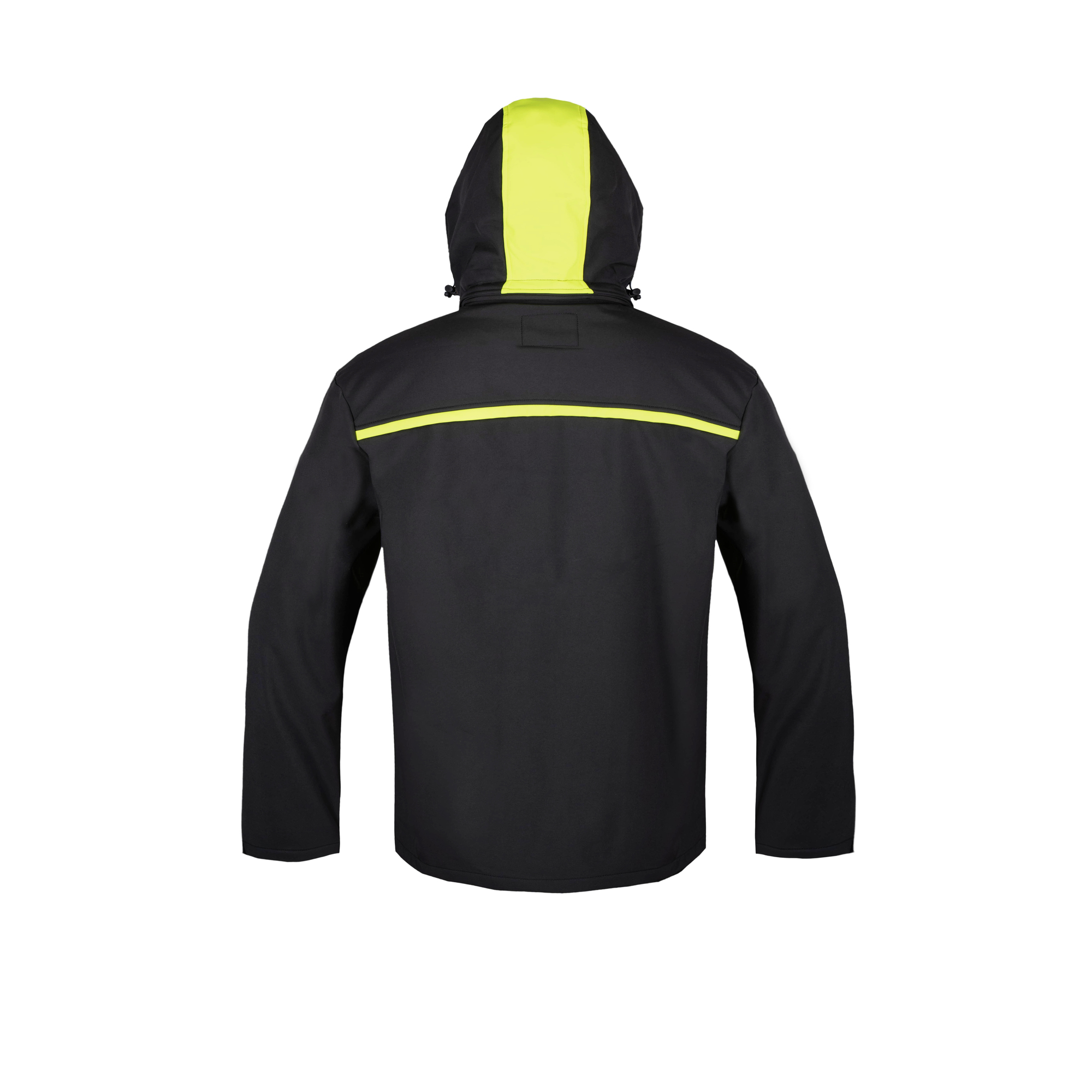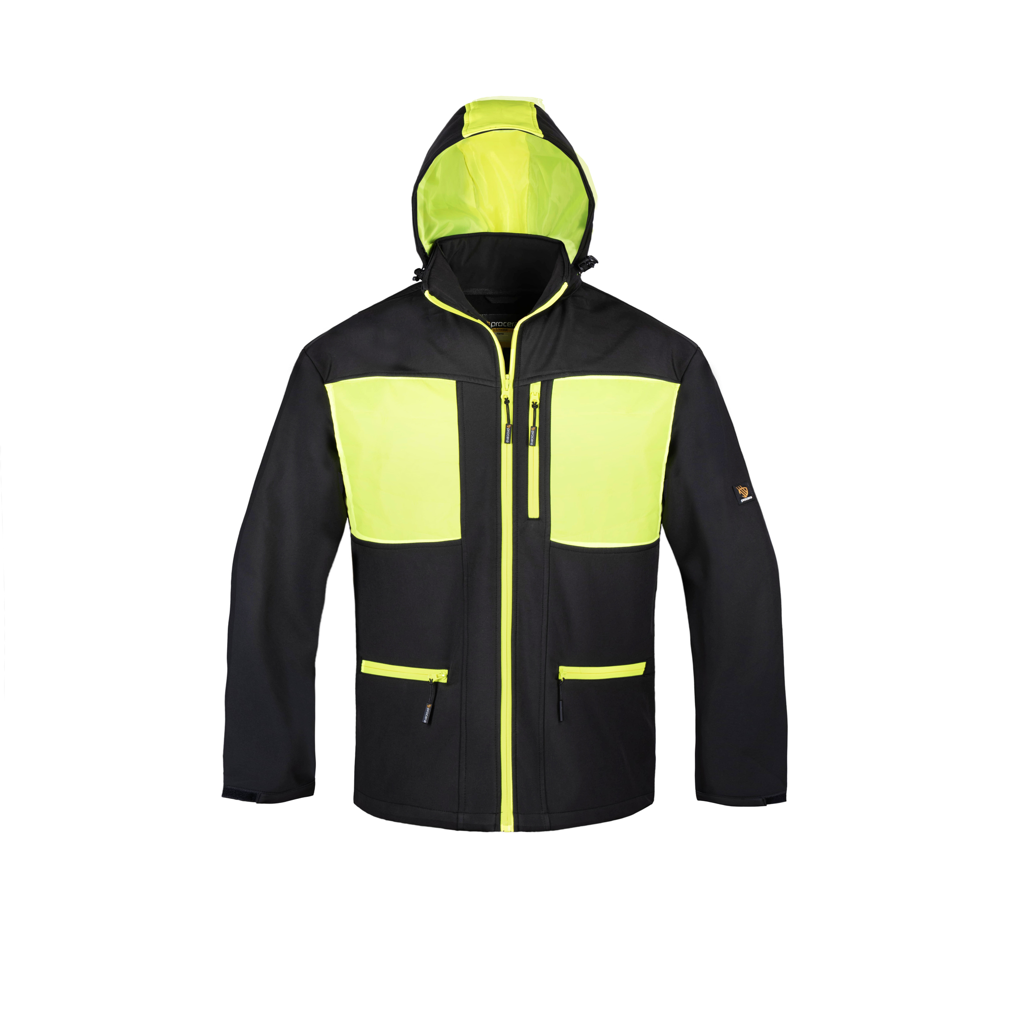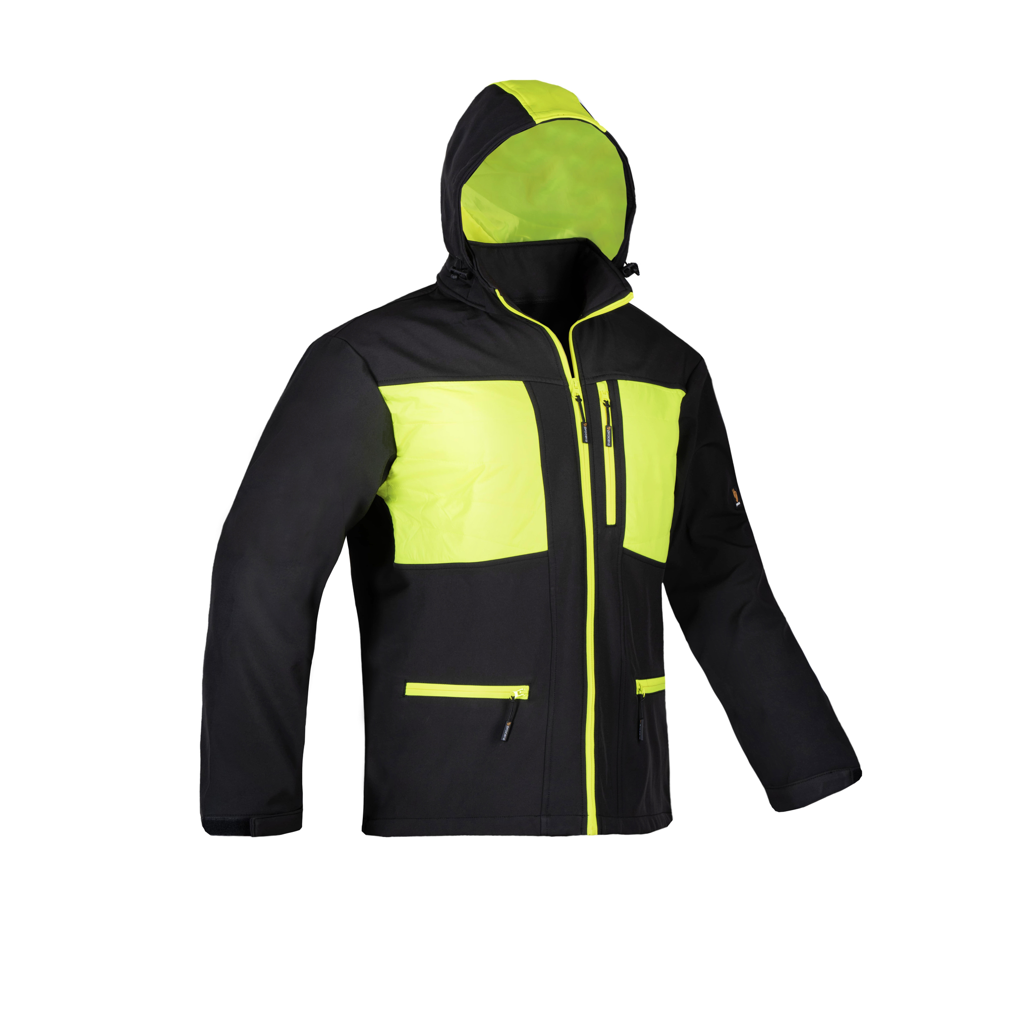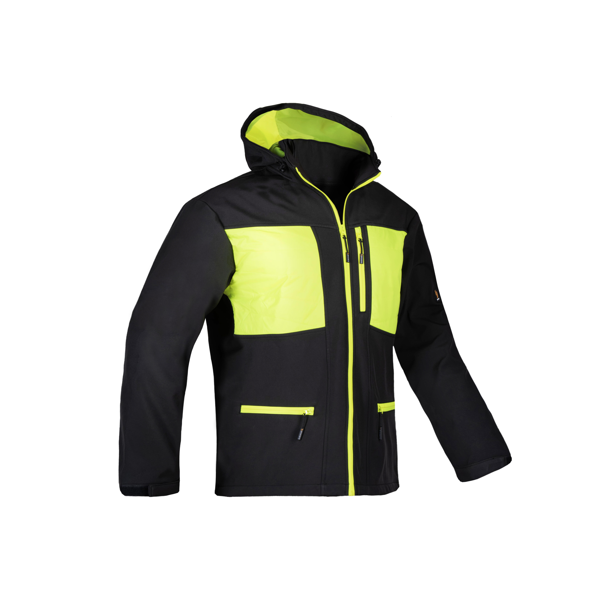 - Kurtka softshell (100% poliester) w kolorze czarnym z żółtymi wstawkami.