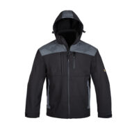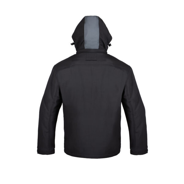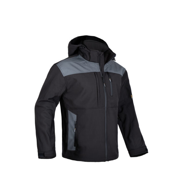 • Kurtka softshell (100% poliester) w kolorze czarnym z ciemno-szarymi wstawkami na barkach, kieszeniach bocznych oraz na kapturze.