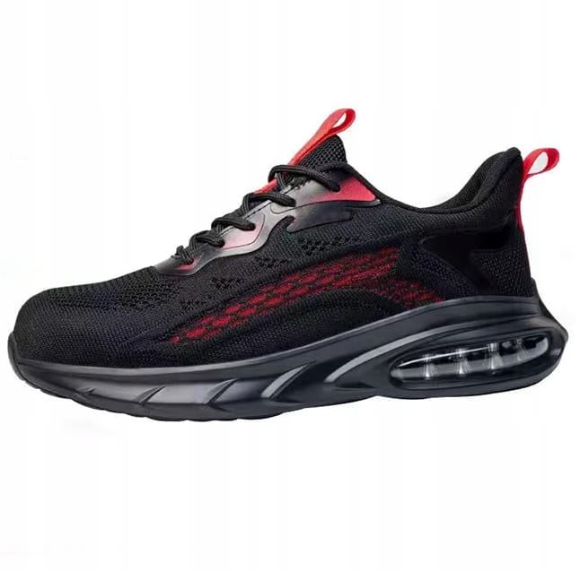 - Cholewka wykonana z dzianiny Fly-knit w kolorze czarno-czerwonym z elementami PVC przy sznurowadłach oraz dodatkowym usztywnieniem w okolicy pięty,