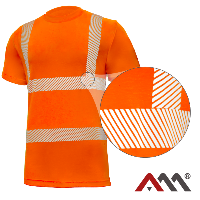 Fluorescencyjna koszulka z krótkim rękawem, z termotransferowymi segmentowymi taśmami odblaskowymi na torsie – pionowymi i poziomymi, z tyłu i z przodu. Gramatura 175g/m2. Skład 45% bawełna, 55% poliester