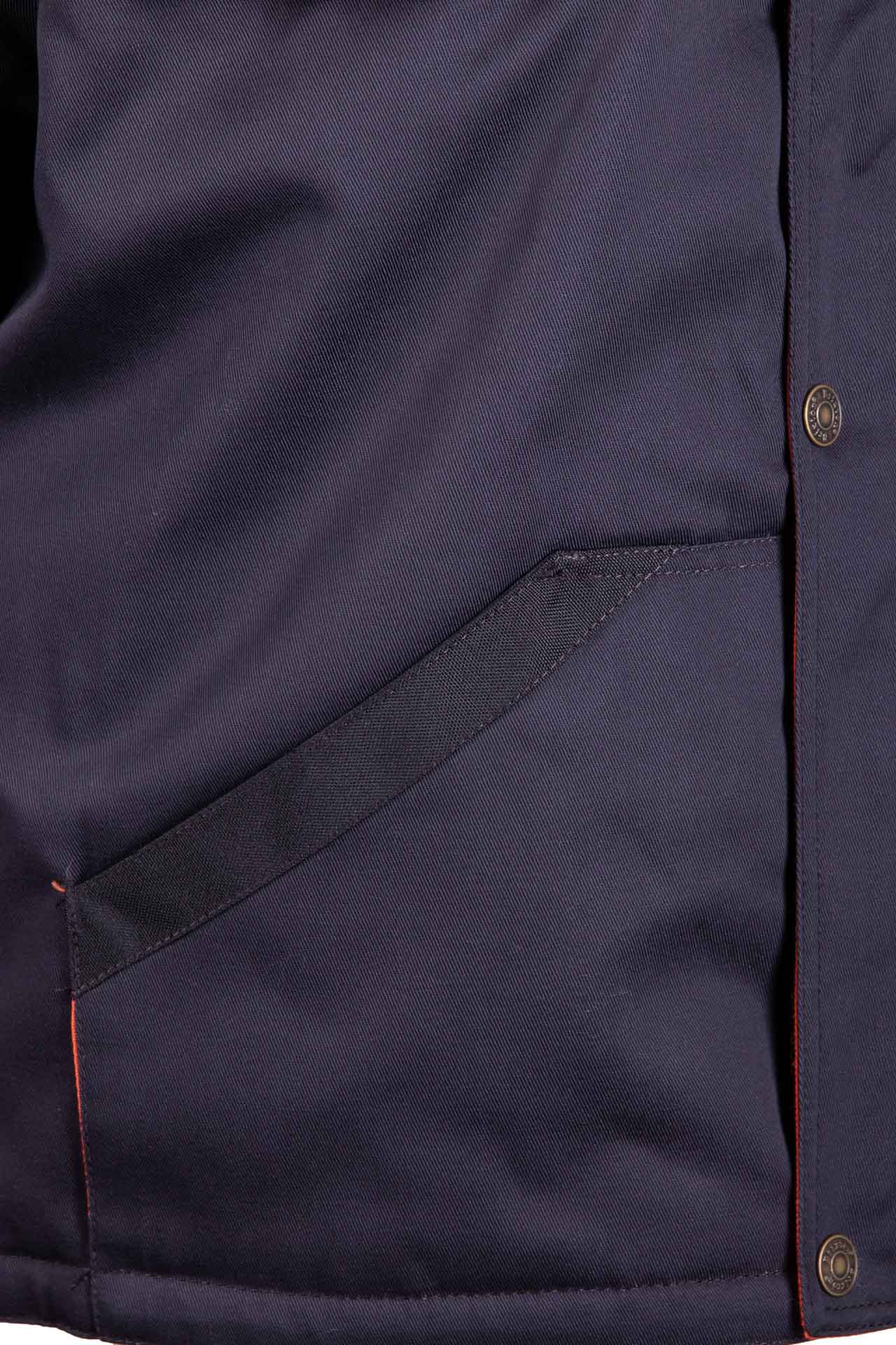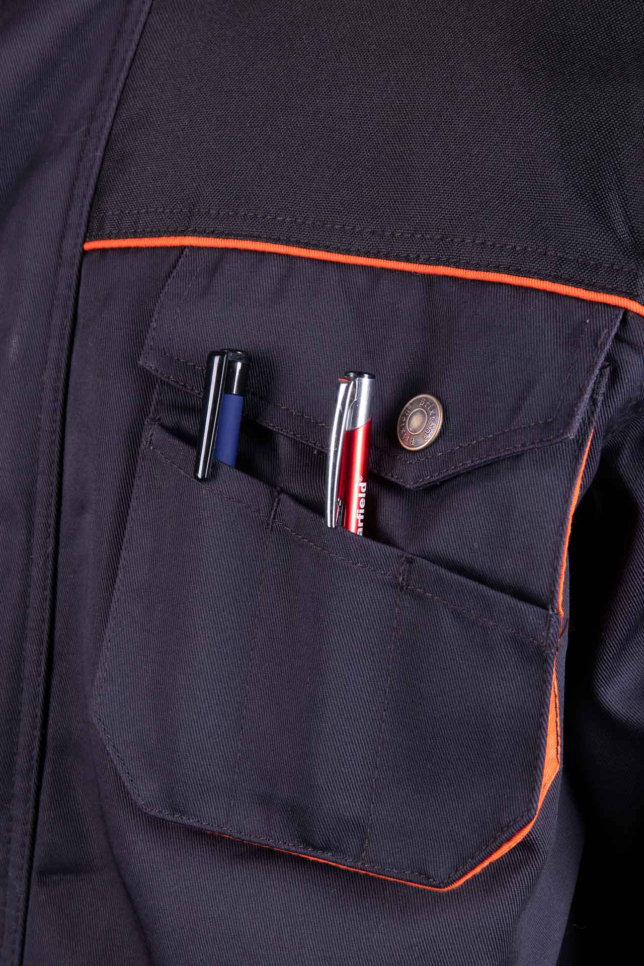 - Kieszenie: Kurtka wyposażona w kieszeń na komórkę, kieszeń na długopisy oraz dwie kieszenie na klatce piersiowej z klapami krytymi listwą i zapinanymi na napy.
