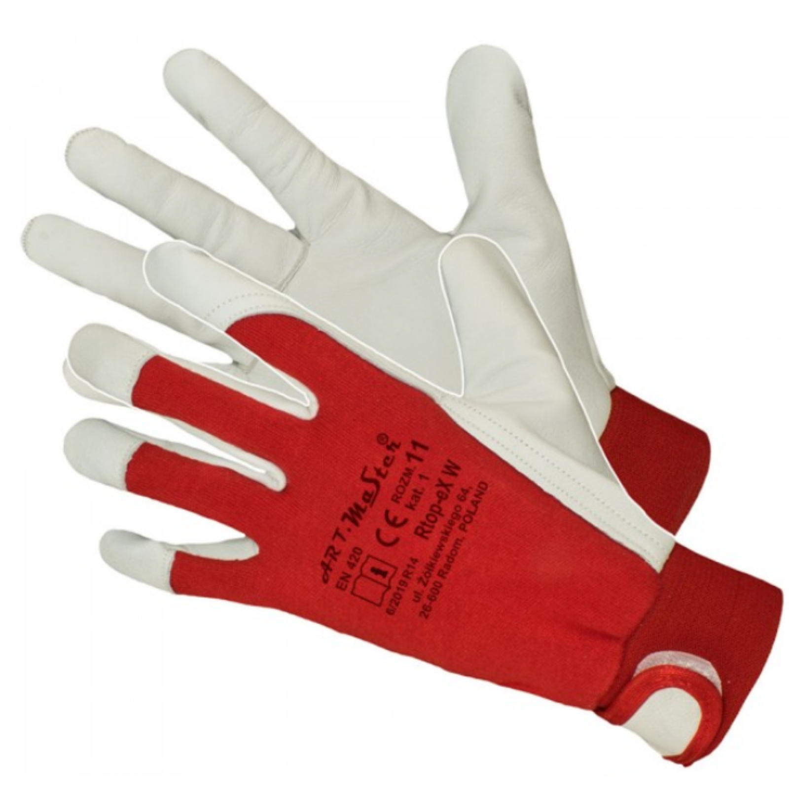 - Część wierzchnia rękawic wykonana jest z elastycznej czerwonej dzianiny, która nie tylko dodaje koloru, ale także zapewnia wygodę ruchu.