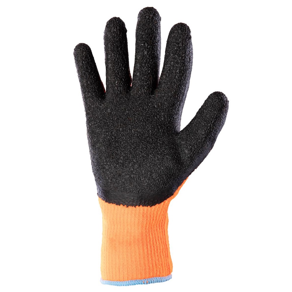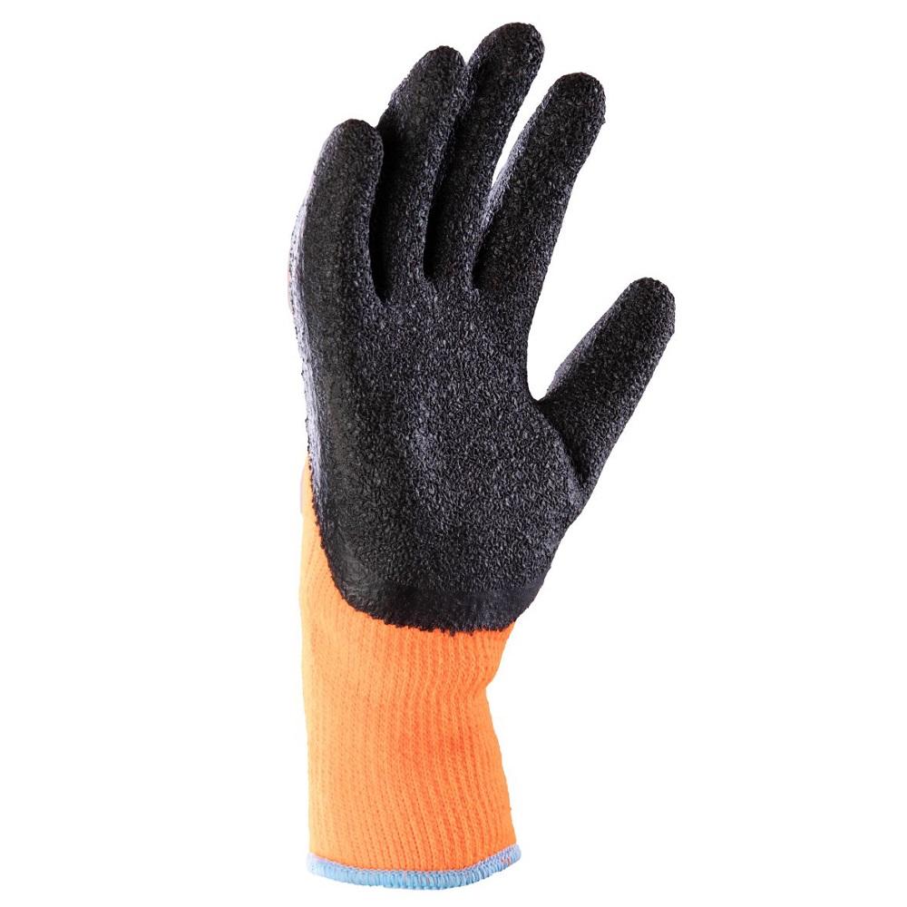 Rękawice ochronne, ocieplane, dziane, bezszwowe. Wykonane z akrylowej dzianiny frote (frote od strony wewnętrznej). Powlekane szorstkowanym lateksem w kolorze czarnym, zakończone ściągaczem. Doskonałe do użytku w warunkach zimowych.