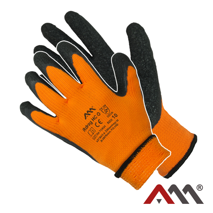 Rękawice ochronne ocieplane, pięciopalcowe, wykonane z żółtej lub pomarańczowej, fluorescencyjnej dzianiny, powlekane szorstkowanym lateksem w kolorze czarnym (na obszarze 1/2 rękawicy). Zakończone elastycznym ściągaczem.