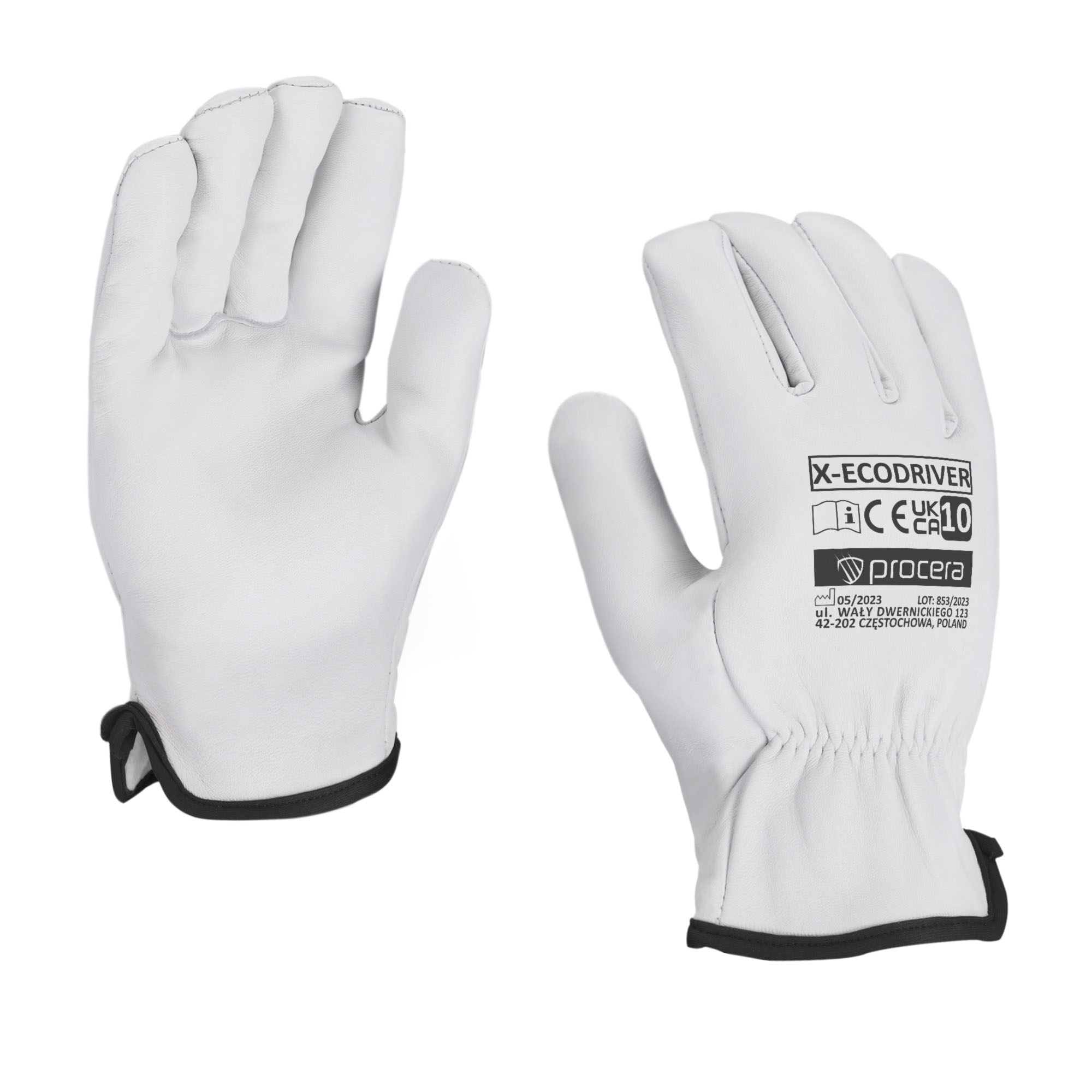 Rękawice X-ECODRIVER wykonane w całości z licowej skóry koziej. Zakończone wygodnym mankietem z gumką. Idealne do prac ogólnych, mechanicznych, transportowych i innych. Bardzo dobra chwytność. Duża wytrzymałość na ścieranie. CE EN 21420:2020. Opakowanie: karton 12/120. Kolor: biały.