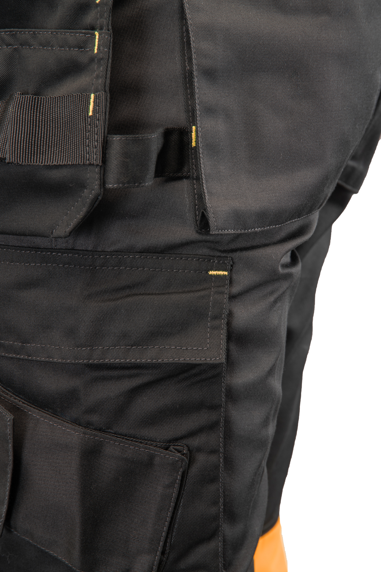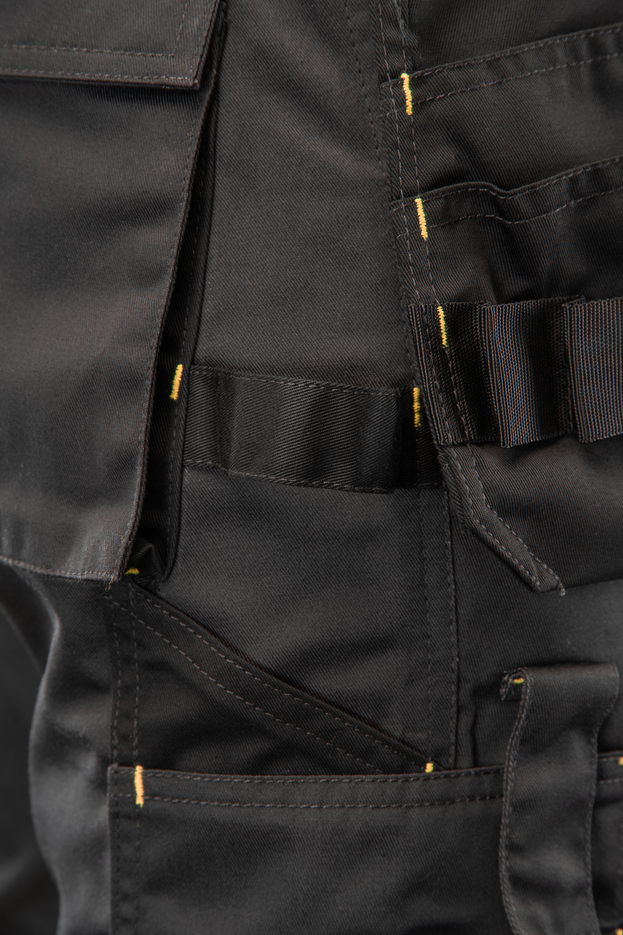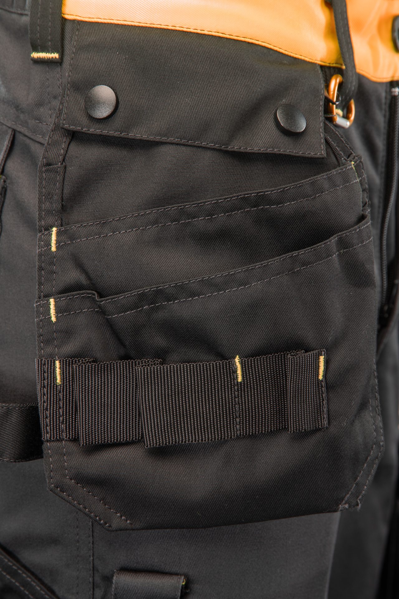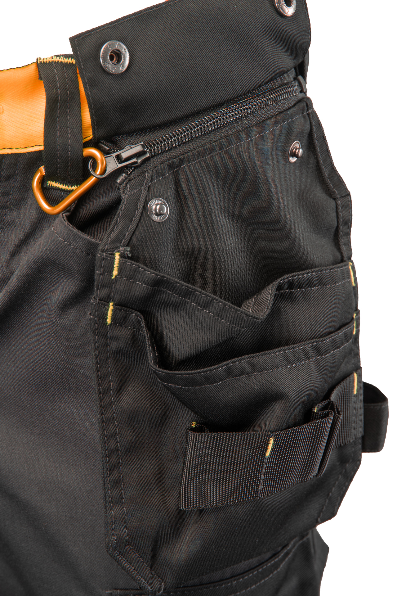 • Kieszenie: Spodnie wyposażone są w różne kieszenie, co znacznie ułatwia przechowywanie narzędzi i innych niezbędnych przedmiotów. Znajduje się tu kieszeń w tylnej części spodni, wzmocnione kieszenie boczne, kieszeń na komórkę, kieszeń na dokumenty, kieszeń na miarkę „metrówkę”, oraz dwie chowane kieszenie monterskie. To duża ilość praktycznych rozwiązań.